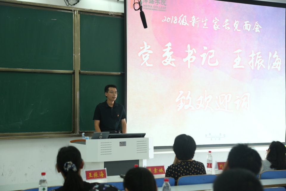 党委书记王振海致欢迎词,他对2018级新生表示欢迎与祝贺。他呼吁家长时时关心孩子健康,与孩子勤联系、勤沟通,学院也将创造良好的教学环境,加强家校联合,共同培养专业性人才。
