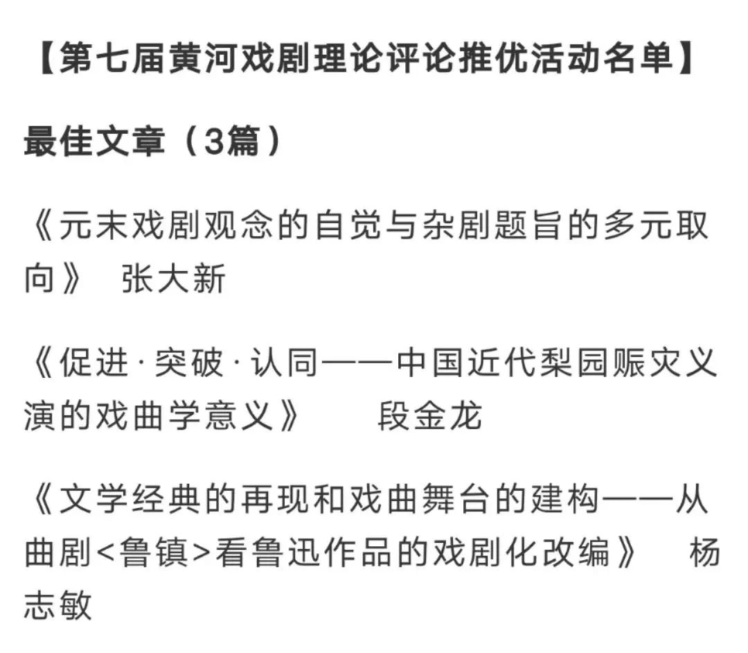 金年会金字招牌诚信至上特聘教授张大新教授以《元末戏剧观念的自觉与杂剧题旨的多元取向》斩获戏剧理论评论最佳文章,段金龙副教授以《促进·突破·认同——中国近代梨园赈灾义演的戏曲学意义》斩获戏剧理论评论最佳文章。