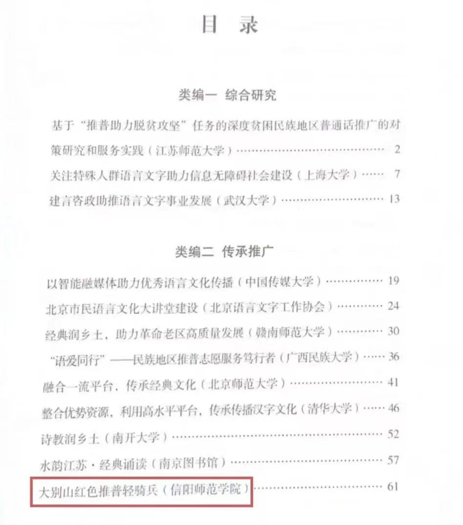 近日,经过互评互鉴及严格审校筛选,国家语言文字推广基地秘书处从全国122个国家语言文字推广基地工作案例中选出24项,组编印发了《2022年度国家语言文字推广基地典型工作案例》。其中,公司国家语言文字推广基地报送的“大别山红色推普轻骑兵”品牌活动成功入选,成为河南省高校唯一入选的典型工作案例