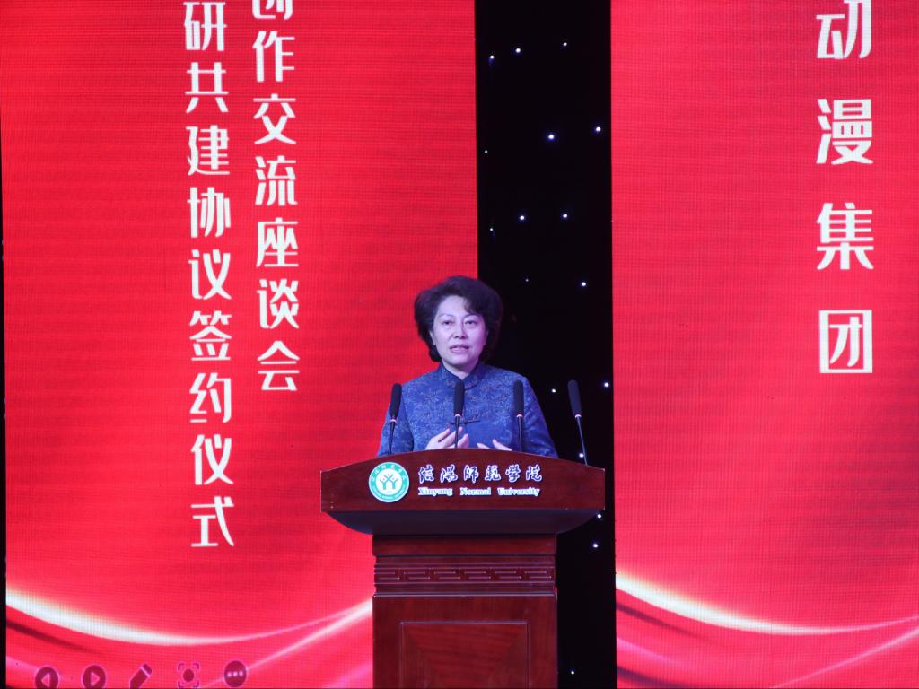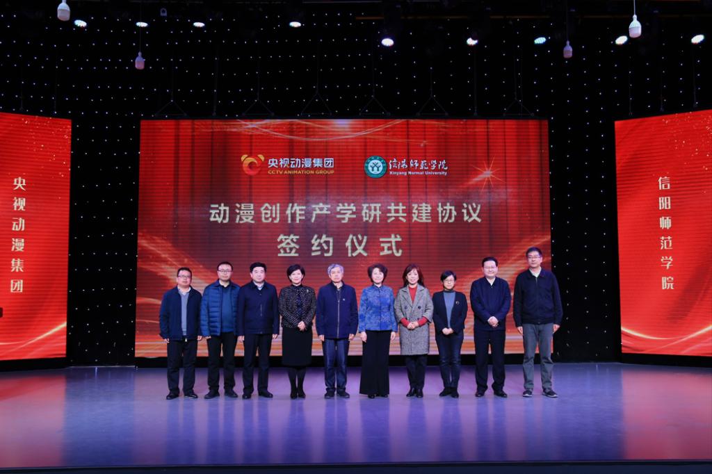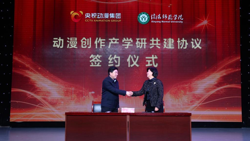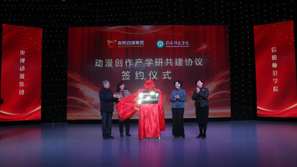 在仪式上,副董事长江玉安和央视动漫集团副总经理王燕代表双方签署了合作协议,董事长李俊、中国动画学会会长马黎、央视动漫集团副总经理王燕、河南省广播电视局副局长李波一起为央视动漫集团有限公司、信阳师范学院“动漫创作产学研共建单位”揭牌。