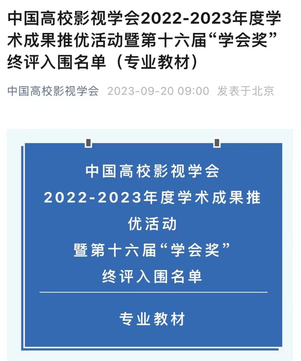 9月20日,中国高校影视学会2022-2023年度学术成果推优活动暨第十六届“学会奖”终评入围结果在中国高校影视学会公众号正式揭晓。公司焦素娥教授专著《影视文化前沿》成功入围2022-2023年度学术成果推优活动-专业教材分类终评名单。