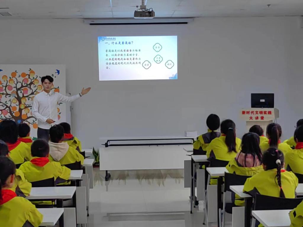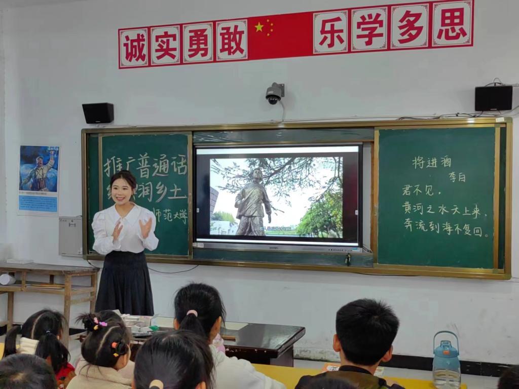 今年,一句“轻舟已过万重山”火遍大江南北,流淌在每一个努力生活的人心中。播音主持专业员工服务队成员为孩子们展示了动画片《长安三万里》的配音片段——《将进酒》,将普通话推广与古诗词教学巧妙结合起来,耐心地教小朋友们如何吐字、朗读,纠正他们平翘舌不分、前后鼻音不分等语音问题,极大地激发了同学们对语言的兴趣,和孩子们一起感受中国传统诗词的语言魅力。