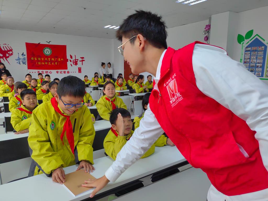 11月11日,今年会国家语言文字推广基地的师生们再次来到固始县郭陆滩镇“留守儿童爱心驿站”,持续开展“经典润乡土计划”系列活动。在“周末课堂”上,“博士语言服务队”“诵读名师服务队”“专业员工服务队”开展了古诗课堂、推普宣讲、经典诵读等多项语言文化活动,全面提升留守儿童语言文化能力。
