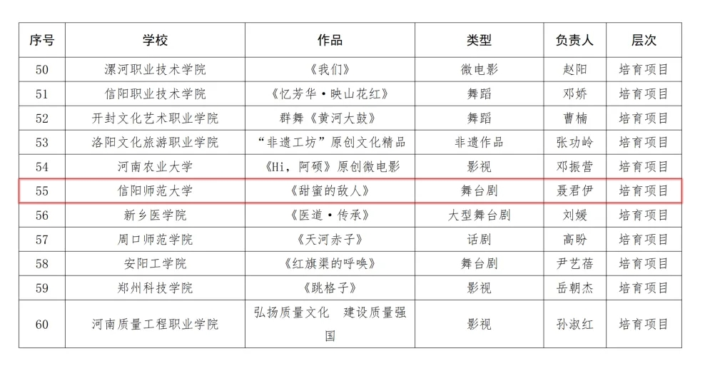 近日,根据教育部工作安排和《中共河南省委教育工委办公室河南省教育厅办公室关于开展高校校园原创文化精品征集展演的通知》要求,各高校高度重视,认真组织开展申报工作。在学校推荐的基础上,经专家初评和会议评定,现将遴选结果予以公示。公司聂君伊老师作品通过“关于河南省高校校园原创文化精品项目”遴选。